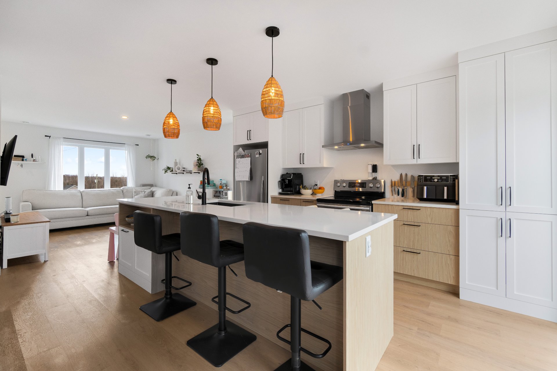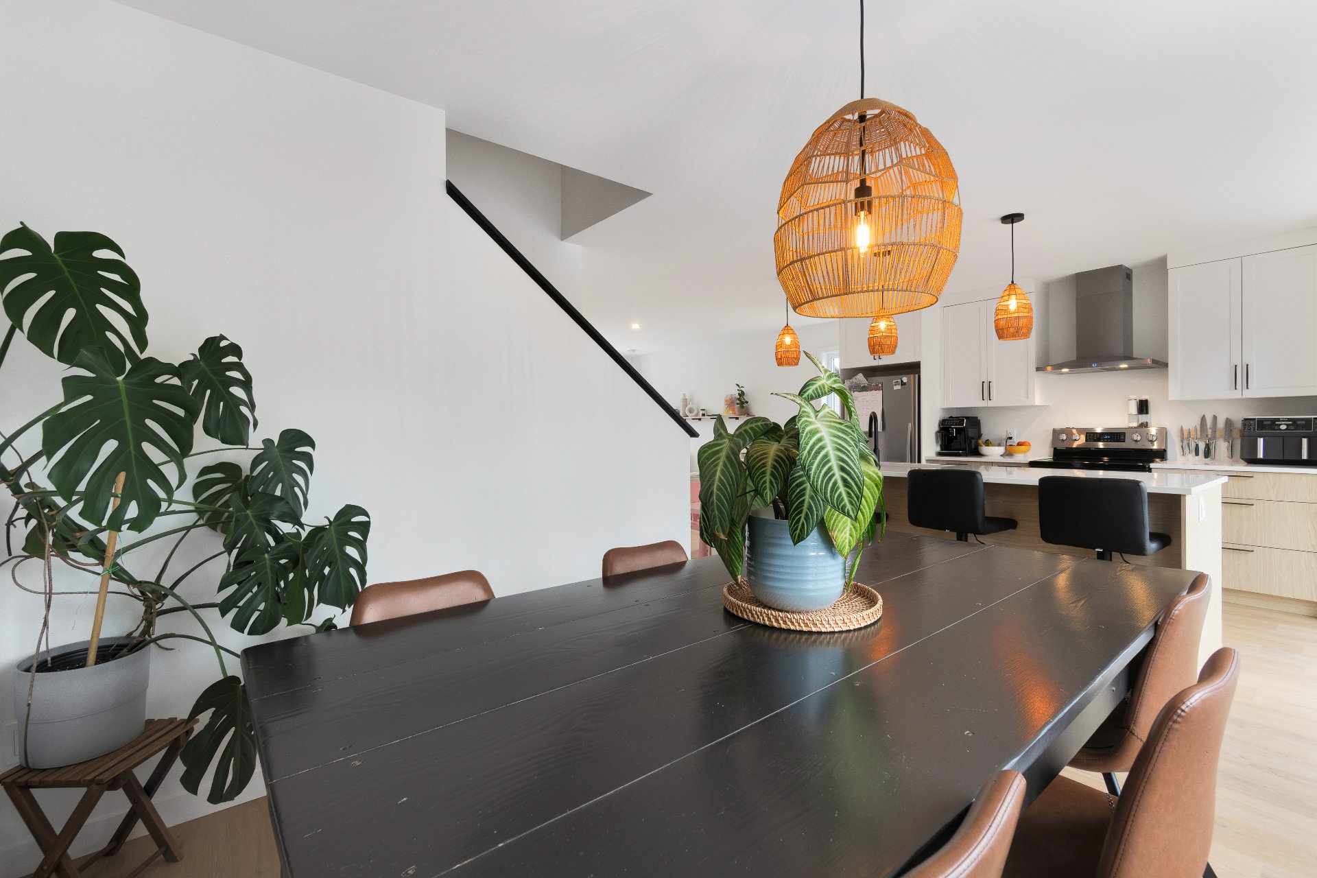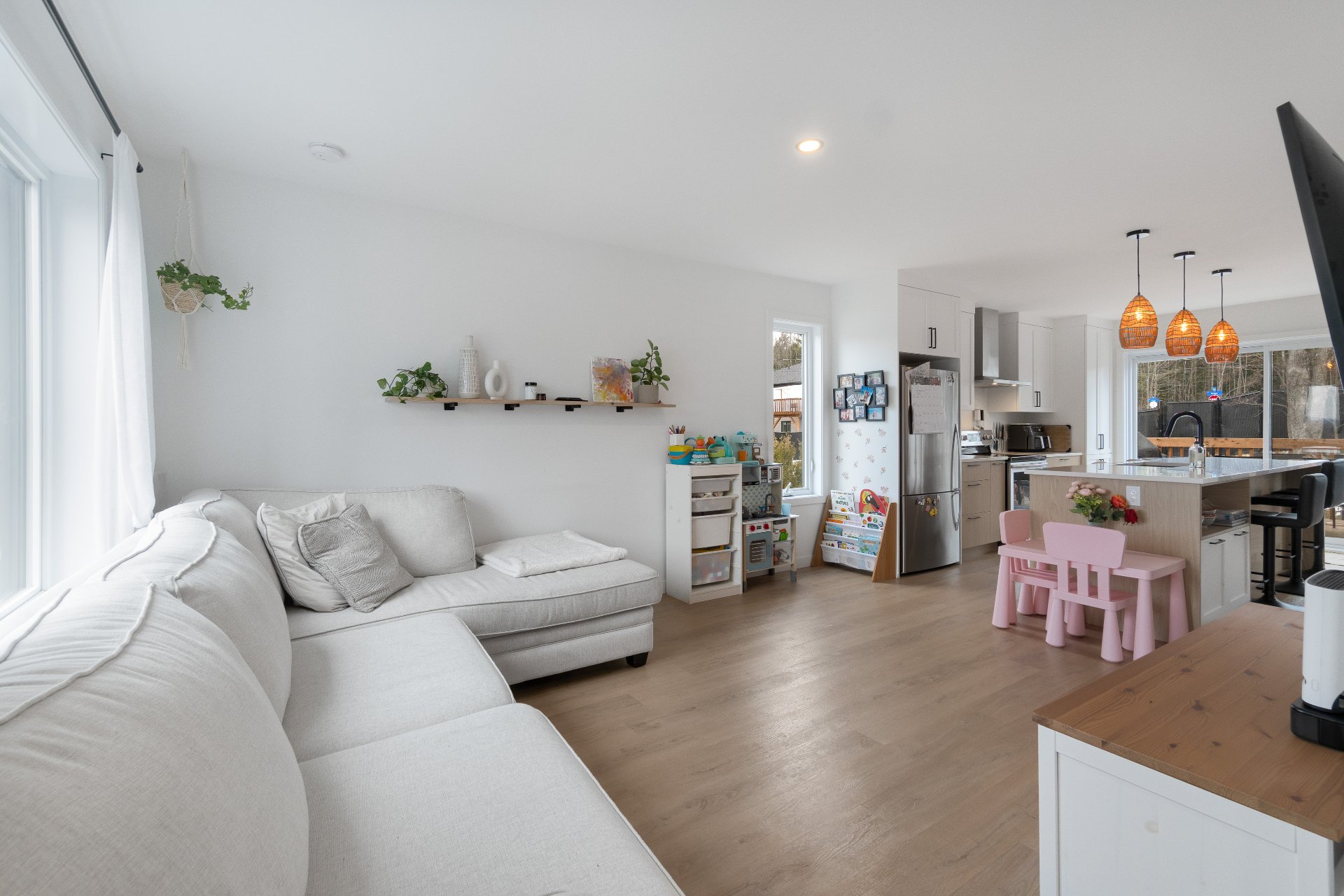 lumineuse où cuisine, salle à manger et salon se succèdent