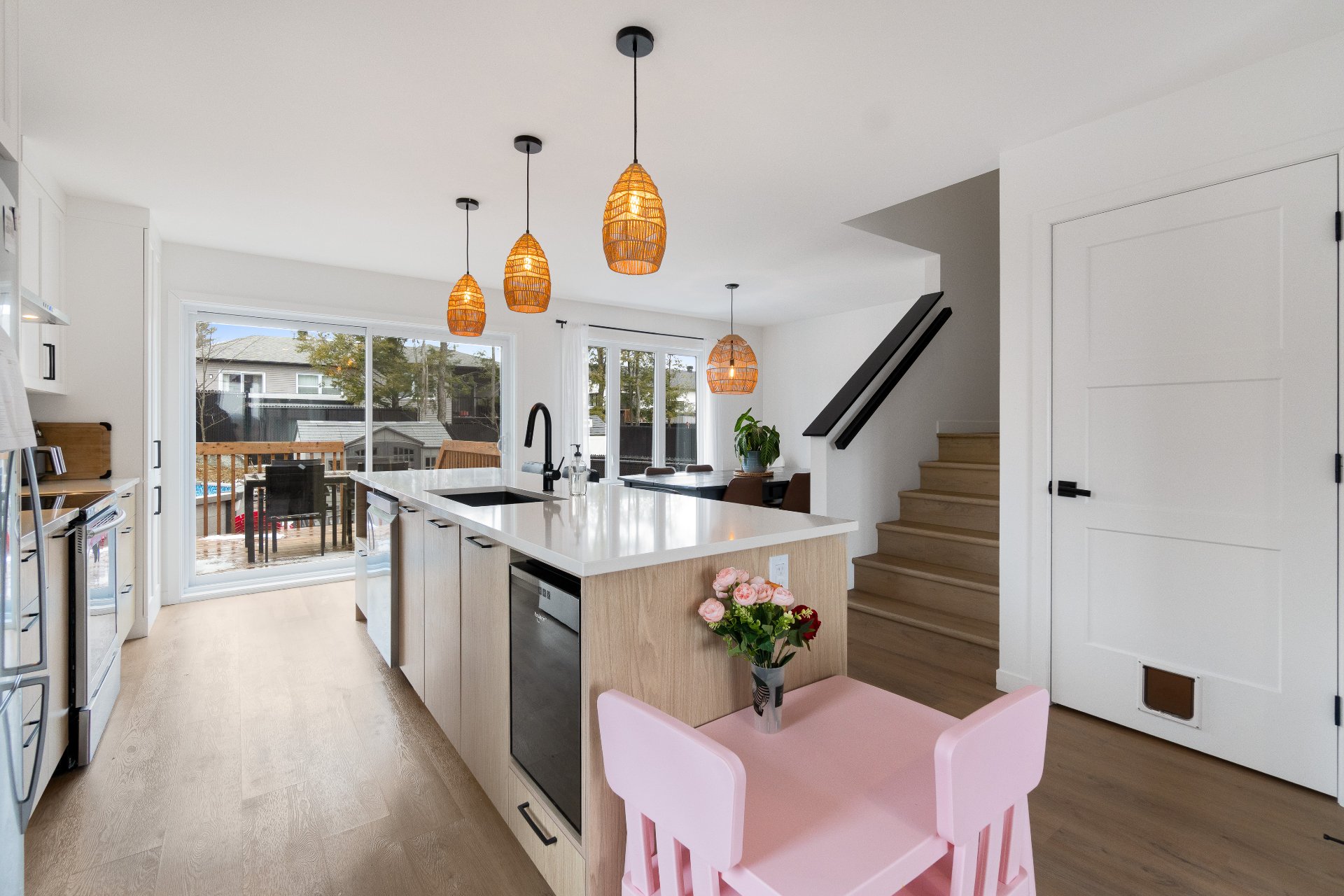 quartz, d'un évier double et d'une grande porte-patio, est