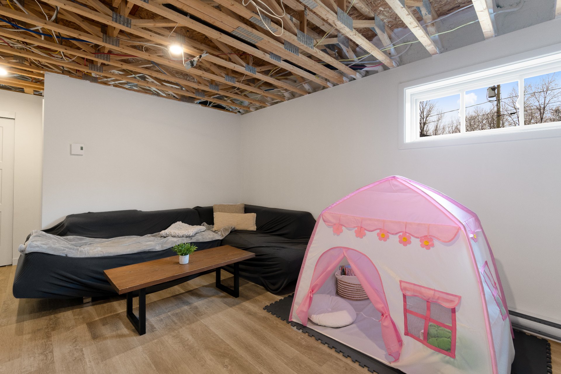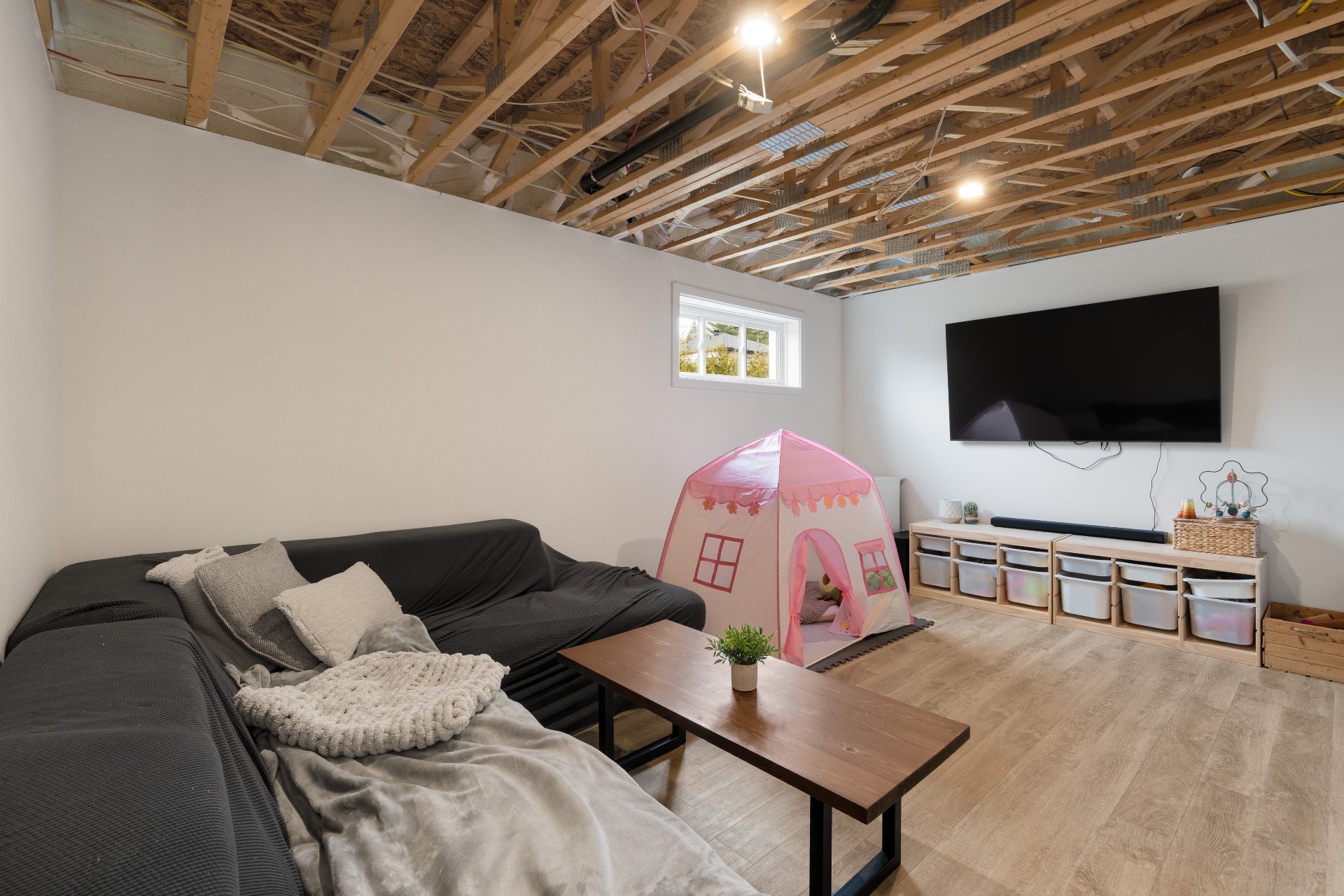 Le sous-sol aménagé offre une belle salle familiale, une