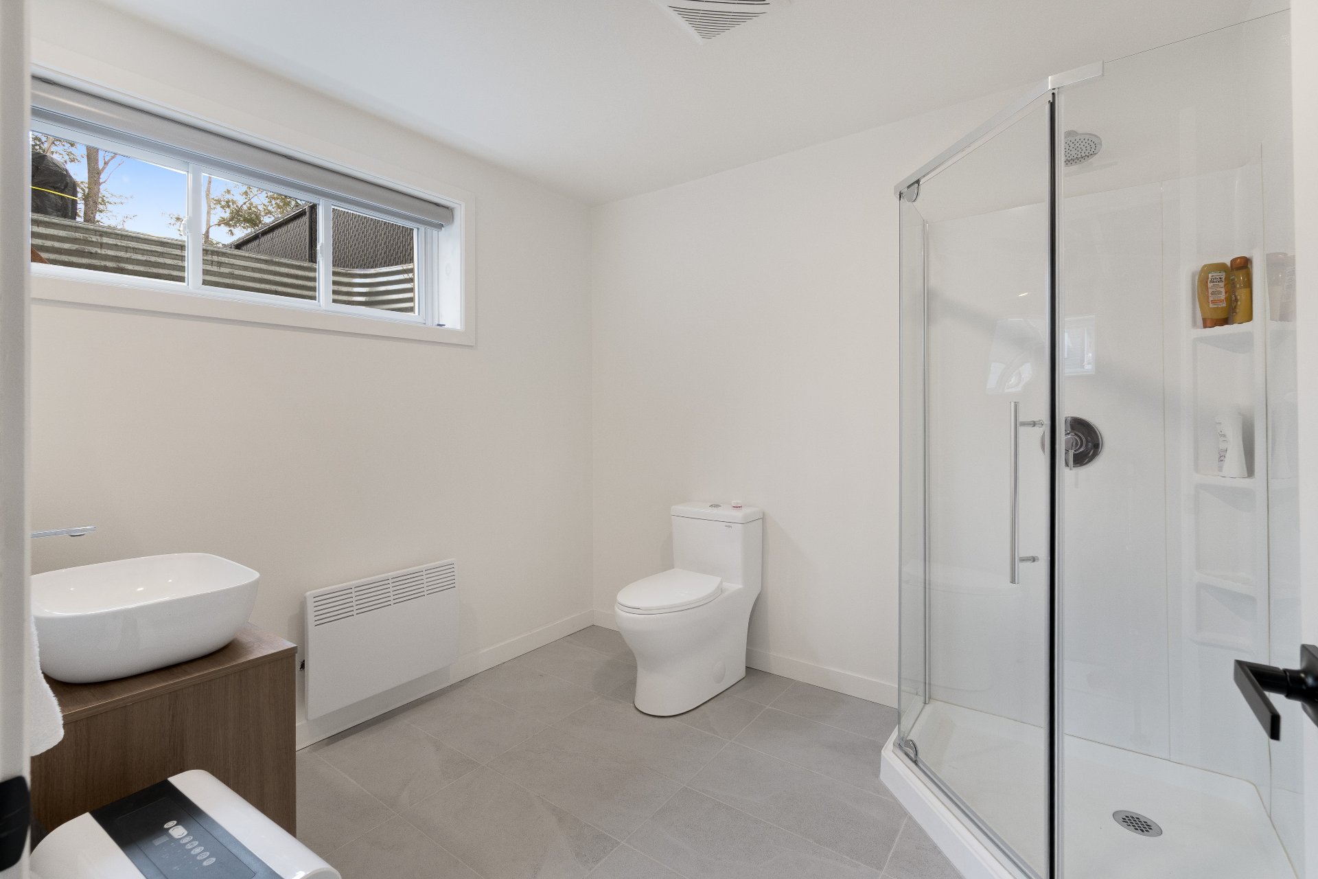 douche en verre et une salle de lavage : un bel espace